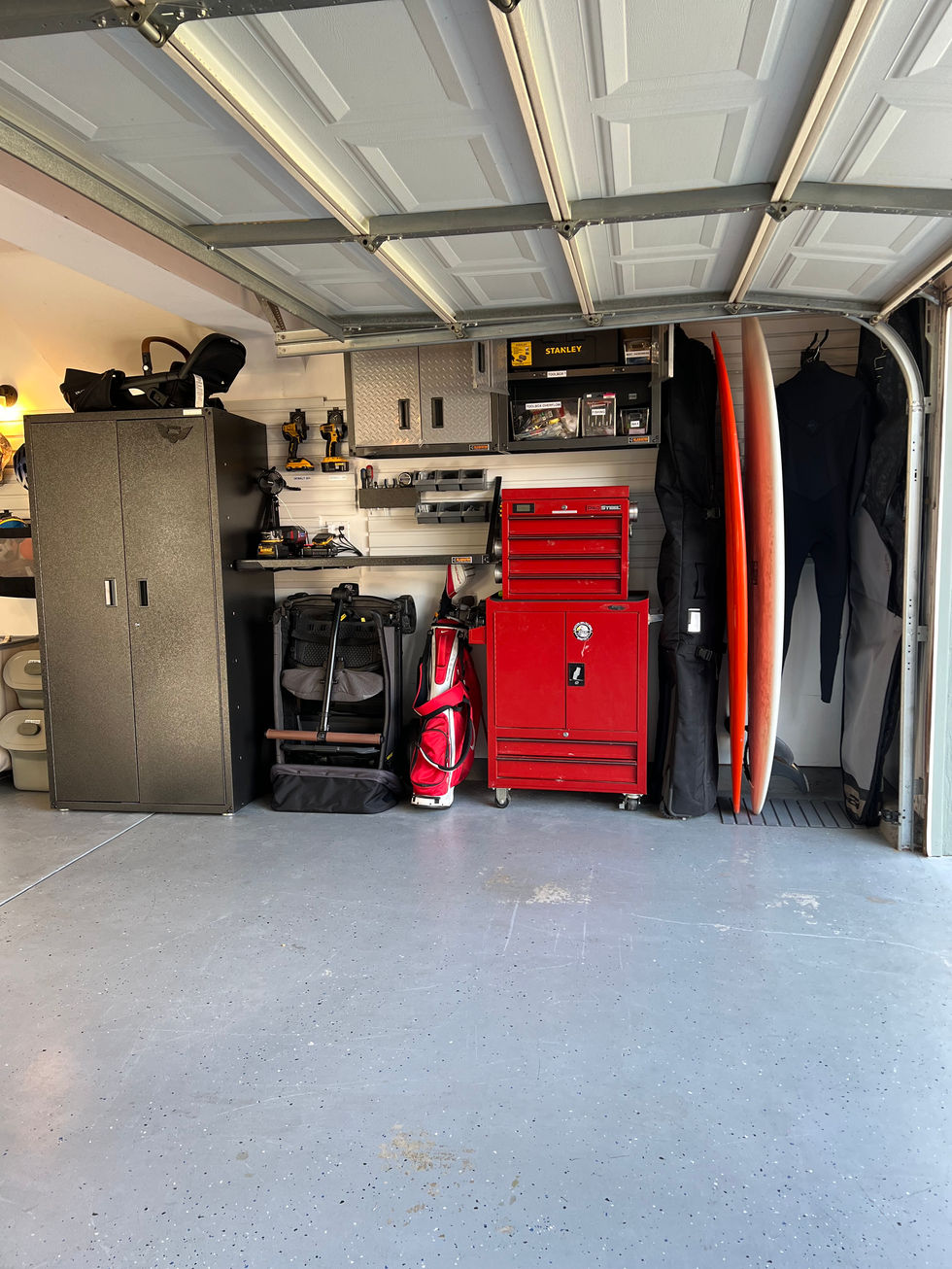 This busy family of four needed their packed garage to function as a home office, sports room, laundry space, tool storage and home gym. They also needed room to park one car. We decluttered and sold 5 large boxes and created functional, labeled zones for their remaining items.